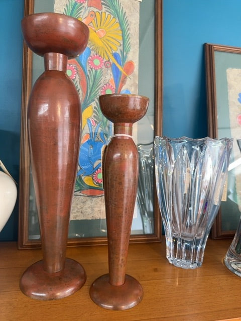 Vintage, set of Bombay oversized candle holders ( set of 2 ) rustic brown metal. Made in India, 16 inch tall, 14 inch shorte.