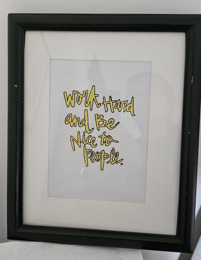 Artist is unknown but this simple piece of art gives good advice: "Work hard and be nice to people."